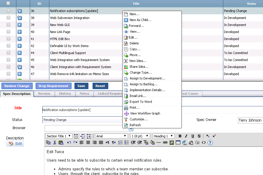 The most used controls in DevSpec such as view file attachments, edit field values, move and copy requirements and many more are available with a single click.
