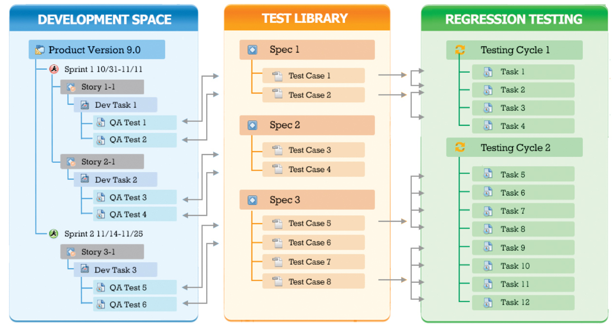 As illustrated in Figure 1, a SpecDD project starts with requirements management. Requirements drive the formation of the product and sprint backlogs for development. QA test cases are created based on these same requirements. QA test cases together make up the QA test library, which defines the product’s quality standards. The QA regression testing team then creates the QA test plan and executes it with multiple test cycles.